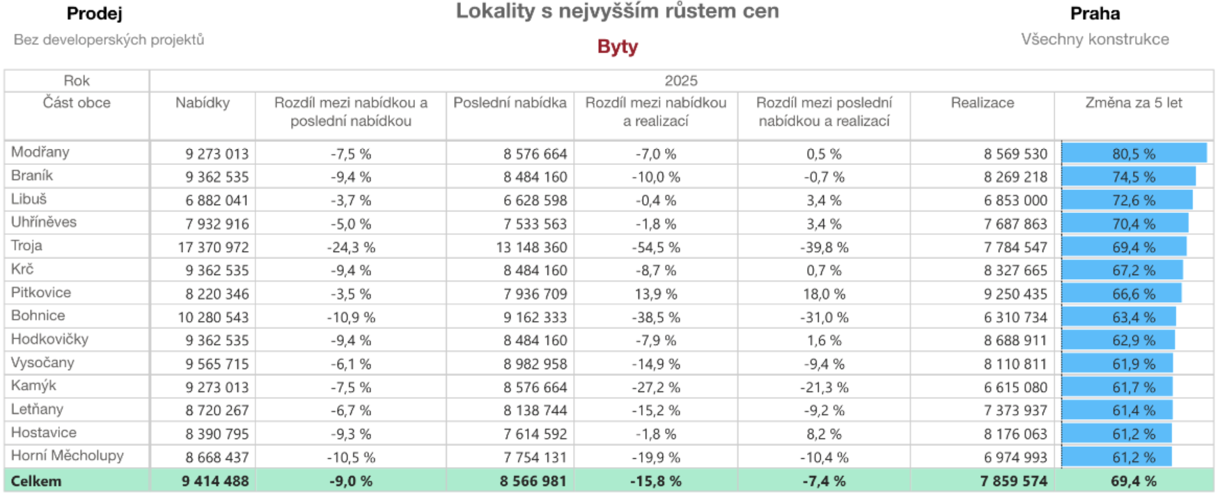 Jednoznačným skokanem posledních pěti let jsou Modřany, kde průměrná realizovaná cena bytů vzrostla o 80,5 %. V těsném závěsu následují Braník (+74,5 %) a Libuš (+72,6 %).