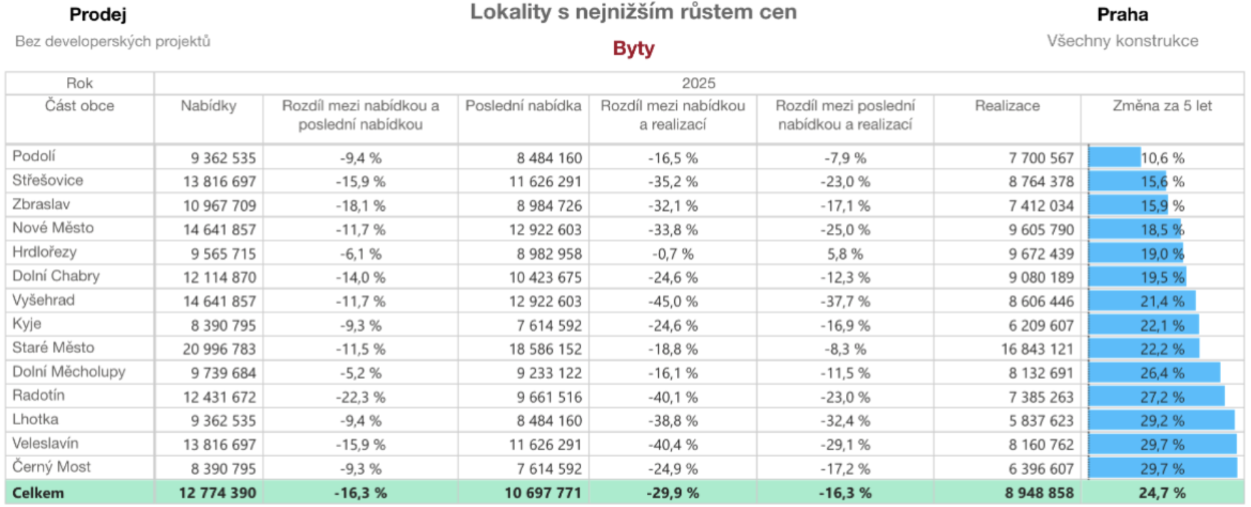 Na opačném konci spektra stojí tradičně dražší části města. V Podolí vzrostly realizované ceny pouze o 10,6 %, ve Střešovicích o 15,6 %.