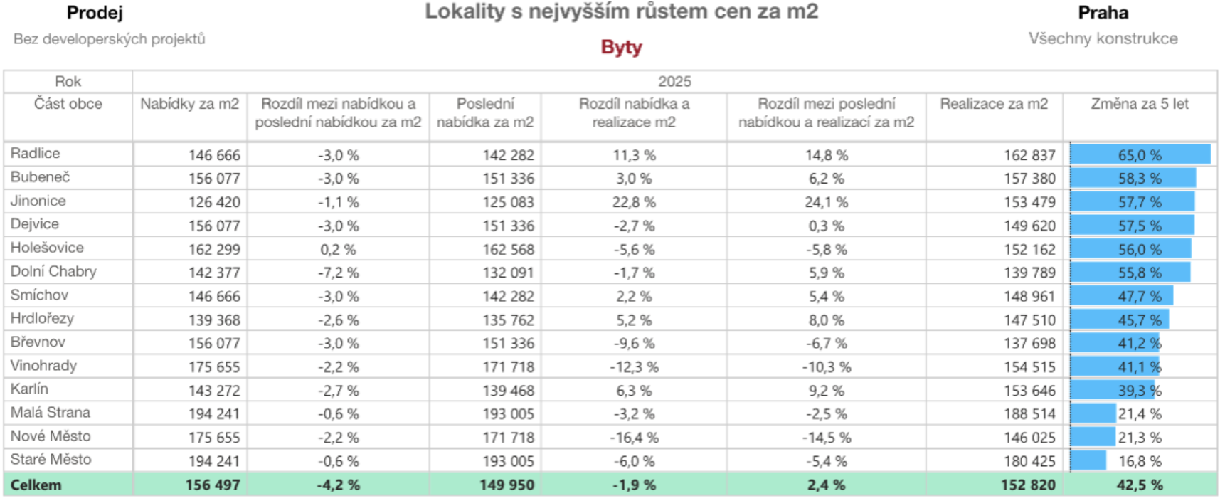 Celkově pražský trh realizovaných bytů za posledních pět let vzrostl o 48,6 %. Pokud však investor hledá nadprůměrný výnos, data ukazují, že se vyplatí sledovat čtvrti, kde se město právě teď rozvíjí – nikoli pouze již "hotové" luxusní adresy.
